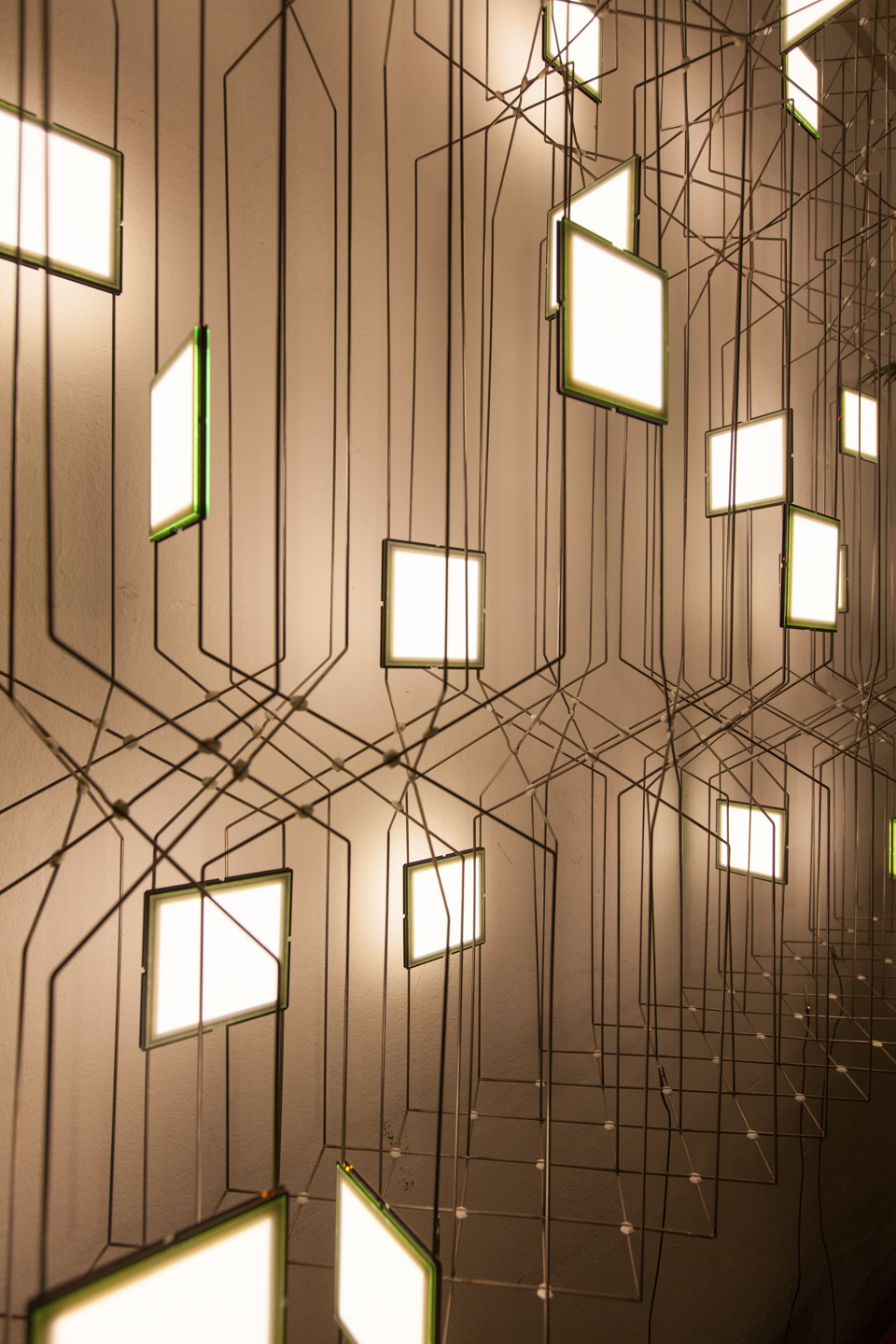 Die Raumstruktur der GRID-Serie besteht aus verkupferten Stahldrähten, welche Konstruktion und Stromversorgung für die OLED-Paneele in sich vereint. Gleichzeitig wird eine fexible Positionierung der Paneele - welche von winzigen Magneten gehalten werden - ermöglicht. Durch den von iart entwickelten «flokk» Controller ist jedes einzelne OLED-Paneel interaktiv ansteuerbar. Die OLED-Paneele in «GRID 8» interagieren mit den Bewegungen der Benutzer und reagieren zudem auf akustische Signale aus dem umgebenden Raum.